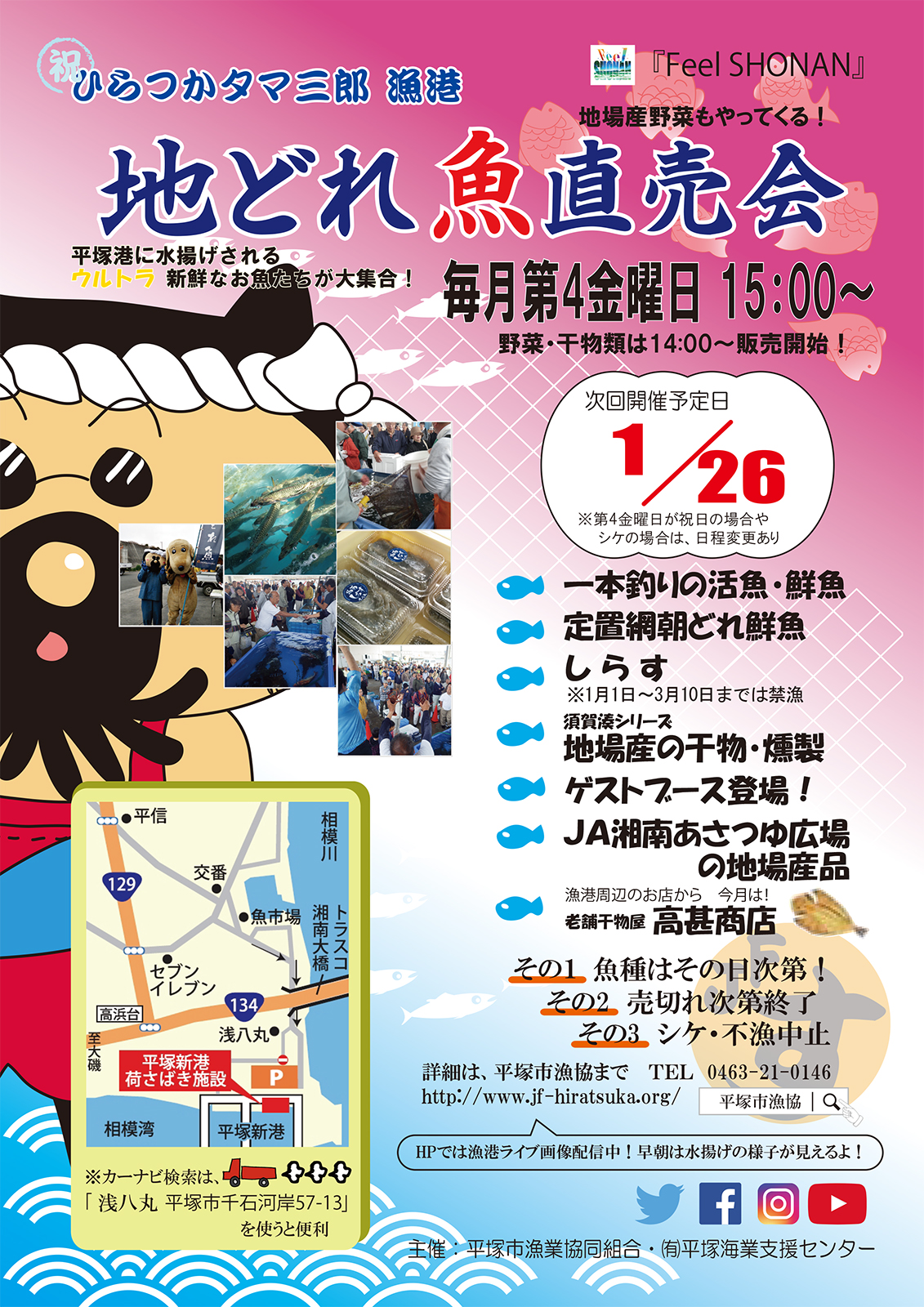 20180126地どれ魚直売会ポスター 2017/12/12 1131 × 1600 年内最後の「地どれ魚直売会」終了!今日は活アジ、カワハギ中心にいろいろな魚種が並びました。次回開催は1/26(金)です。