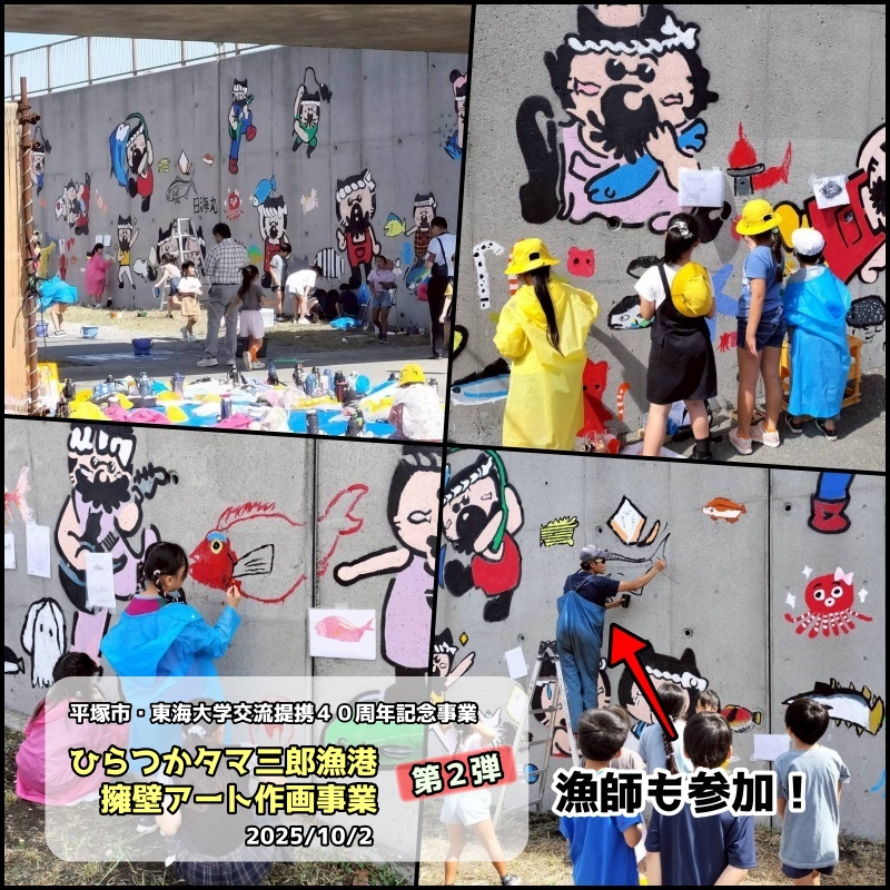 漁港de平塚市・東海大交流提携40周年記念事業(第2弾)港小学校3年生が壁画アート、漁港がさらに賑やかに。